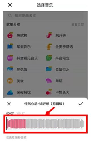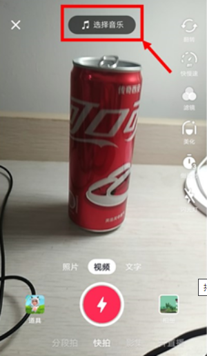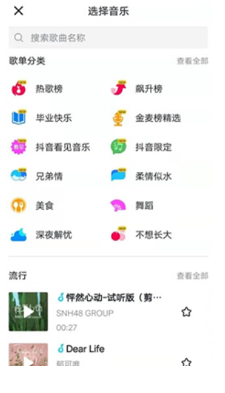 点击视频拍摄界面上方的“选择音乐”图标,进入选择音乐界面。