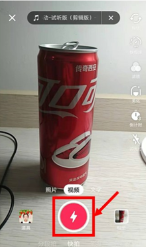 长按视频拍摄界面下方的红色图标进行拍摄,松手即可停止拍摄。