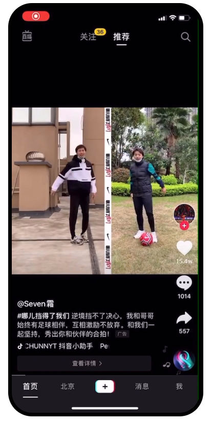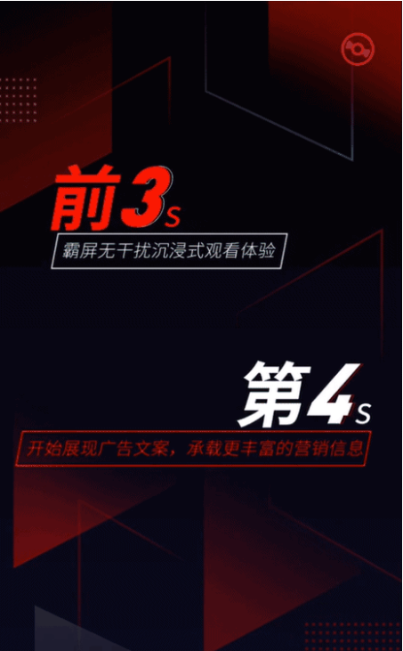 这类广告算是抖音首创的一种曝光形式,它的主要特点是以开屏加首条信息流视频的方法在视频的前3秒超级曝光,然后在第4秒的时候可以无缝衔接长达60秒的一个品牌信息,从而达到营销的目的,这样的广告形式可以完成一种沉浸式的触达。如下图所示: