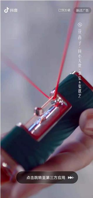 开屏广告在抖音上是比较常见的一种广告类型,它的特点在于给人的视觉冲击力极强,基本上不存在干扰,可以满足广告主的曝光诉求,支持静态、动态、全屏和非全屏等类型,不仅如此,开屏广告还支持落地页直接跳转品牌页面,或者也可以选择站内页面跳转。如下图所示:
