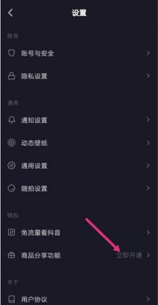 在设置中下拉找到商品分享功能,确认满足条件后,点击立即开通的按钮,输入所需要的信息,如手机号,微信号等。